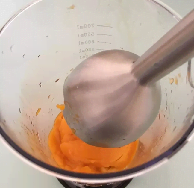 3. 将切好的芒果丁倒入料理棒量杯打成泥;