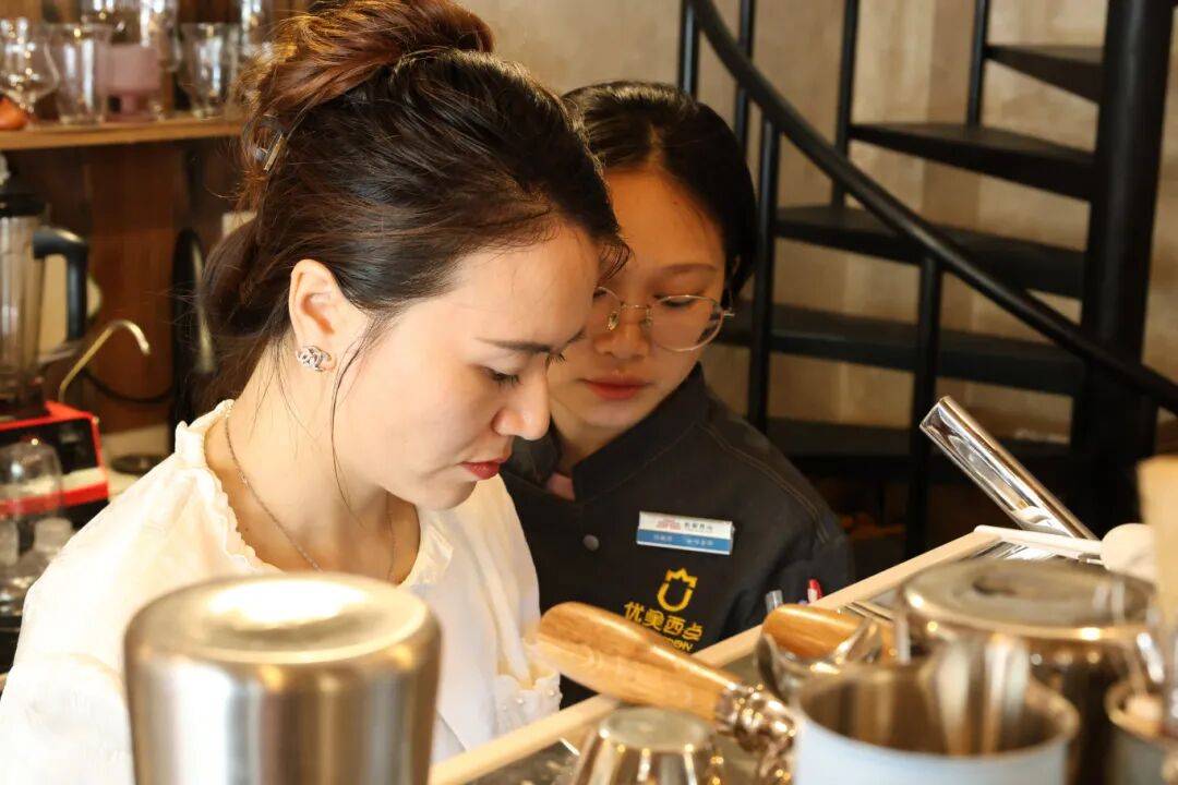聊起在优美西点的学习时光,她的眼神瞬间亮了:“学校的氛围特别治愈!老师会盯着我们反复练拉花,哪怕手腕酸了也鼓励‘再试一次’;同学之间会分享各自私藏的风味组合,我现在店里的爆款产品,灵感就来自当时和同学的闲聊。” 这种专业又温暖的环境,让她在短短数月里,不仅掌握了技术,更坚定了 “用饮品治愈压力” 的创业方向。