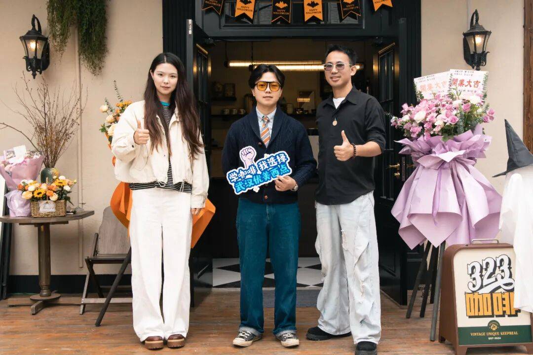 武汉洪山区汤逊湖社区大港村 114 号热闹非凡,优美西点创业班毕业生官官的门店 ——323cafe 在此盛大开业。优美西点咖啡研发教师汪老师与市场老师一同前往现场,为毕业生送上真挚祝贺,学校还特意送去花篮,为开业现场增添了喜庆氛围。