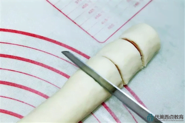 10、用小刀将香肠卷切成2cm左右的小段。