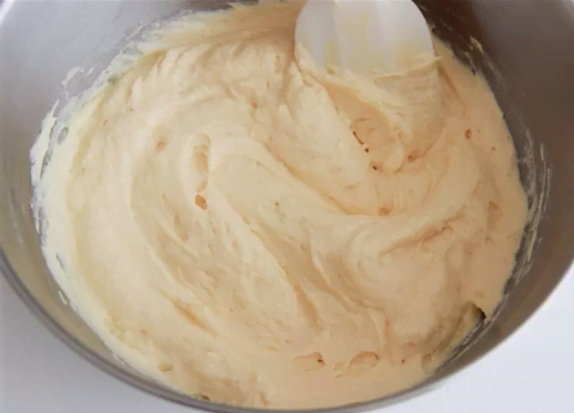9、把蛋白霜分2次加入黄油面糊中,每次加入都要用刮刀翻拌均匀再加入下一次。