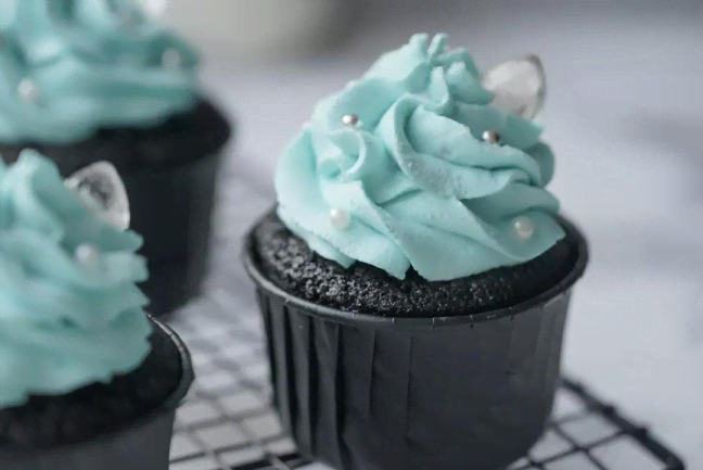 4、奶油装入裱花袋(我用的是六齿裱花嘴,多于六齿的话,挤出来的奶油会缺少花边的感觉),取出蛋糕胚,挤上奶油,摆上银色和白色两种糖珠装饰。