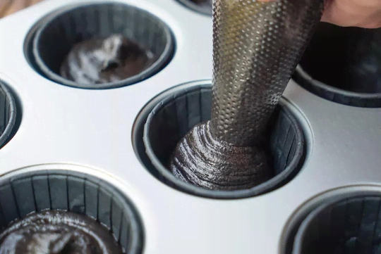 3、过筛加入170g低筋面粉和45g黑可可粉,再加入8g泡打粉翻拌均匀。