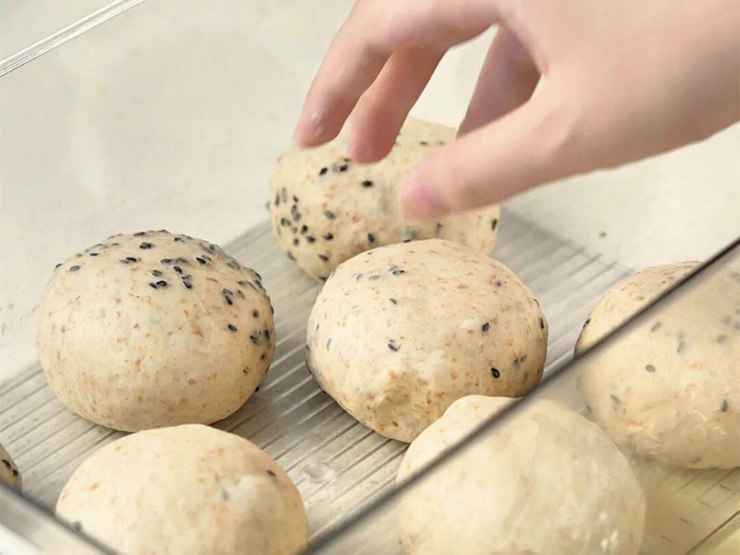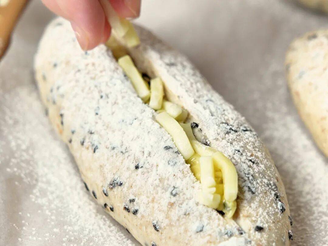 1.将面团部分除黄油外所有原料中速打至六成筋度。加入黄油中速打至八成筋度。加入芝麻搅匀后取出。