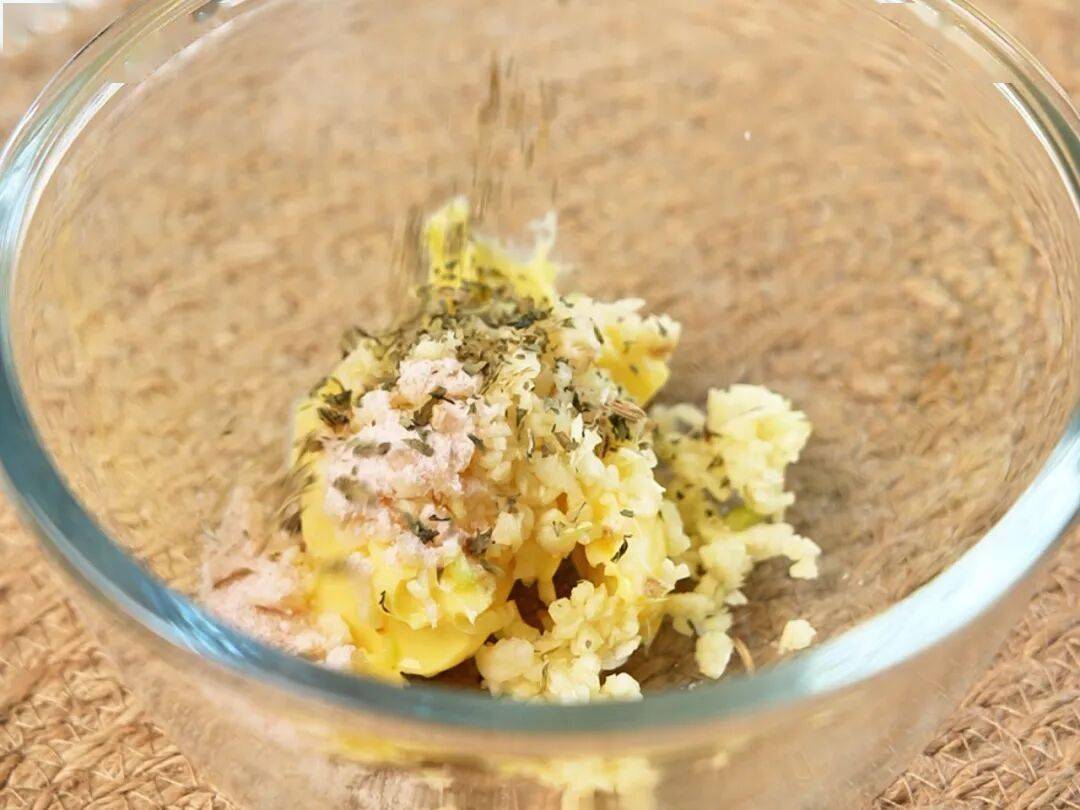 4.蒜蓉酱:将软化的黄油、海盐、蒜沫、欧芹碎搅匀备用。