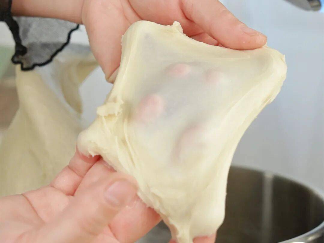 1.甜面团:先将除黄油、盐以外的所有原料倒入厨师机中,低速打匀再高速打至厚膜,加入黄油、盐低速打匀转高速打至手套膜出缸,摔打两下收圆。30度发酵大约50分钟左右,发酵至面团的1.5-2倍大。