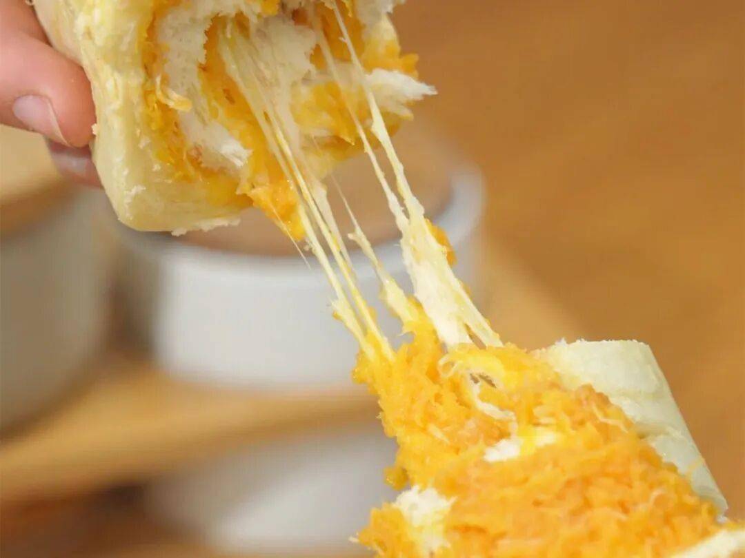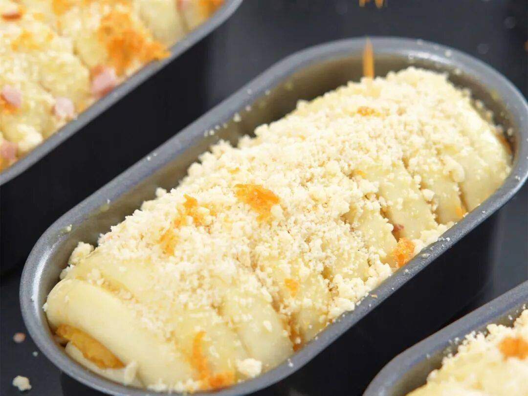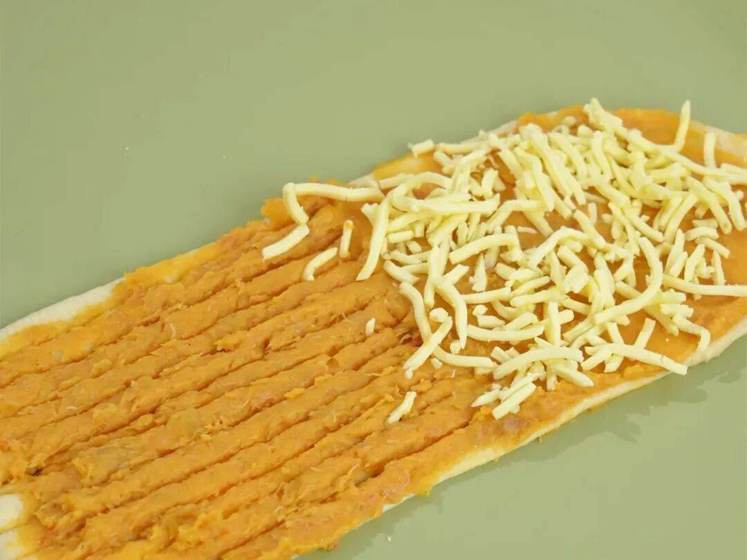 3.将发酵好的面团取出分割120g/个,排气揉圆,松弛15分钟左右,擀开翻面抹红薯馅,如视频中顶1/2处撒芝士碎,下面切割条,卷起放入模具。35度发酵40分钟左右。