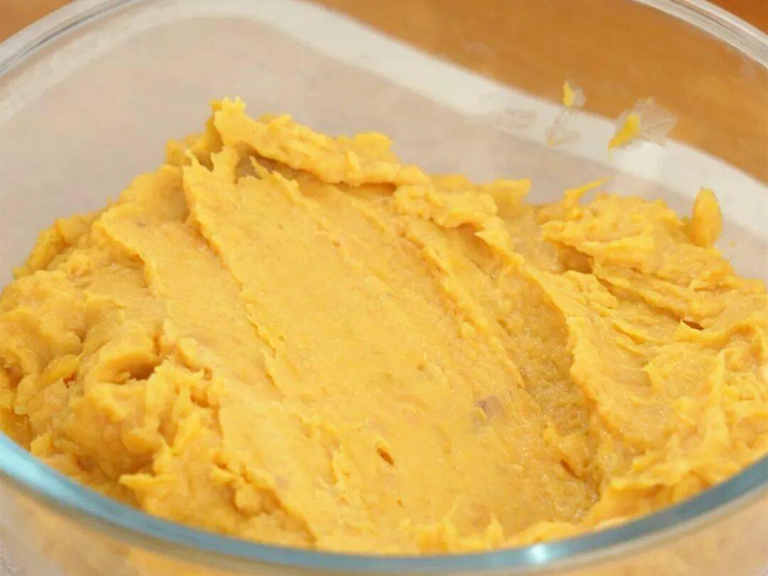 2.红薯馅:发酵时间来做红薯馅,蒸熟的红薯与其它原料倒入厨师机中硅胶浆搅打均匀,倒入盆中备用。