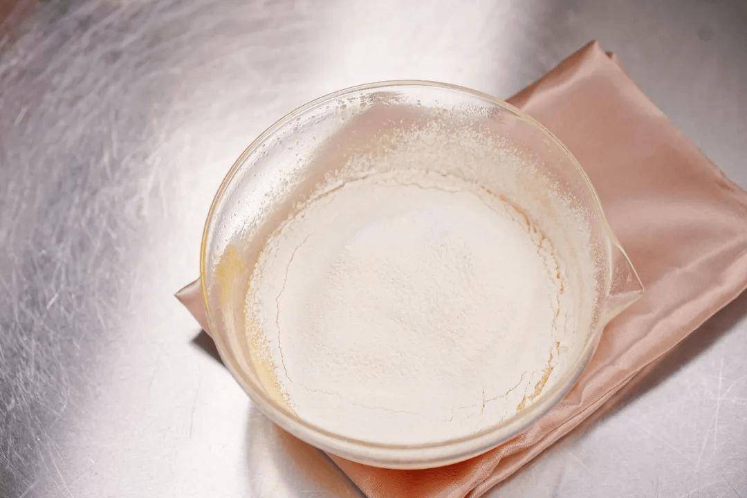 1/3 200G蛋液中加入55G白砂糖搅拌均匀后,倒入70G过筛的低筋面粉,搅拌均匀至无面粉颗粒。