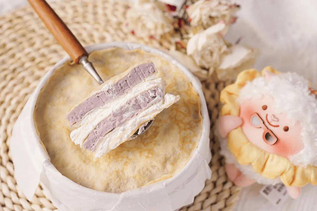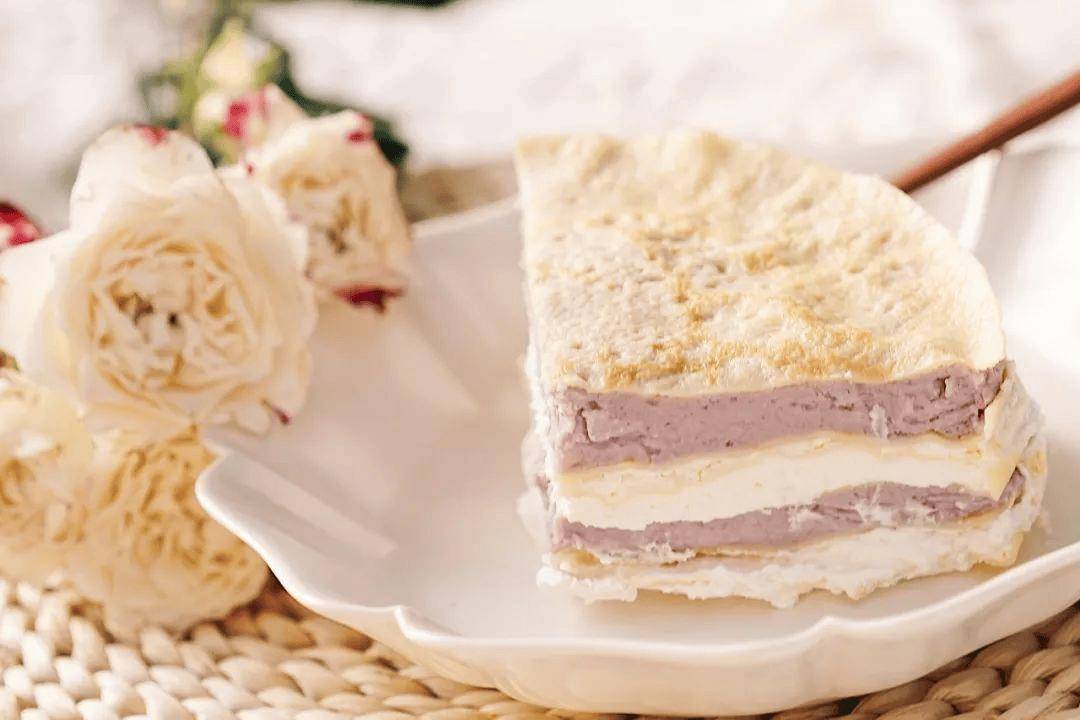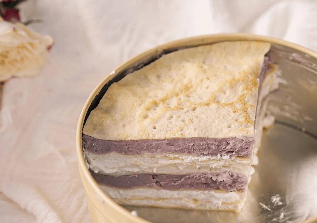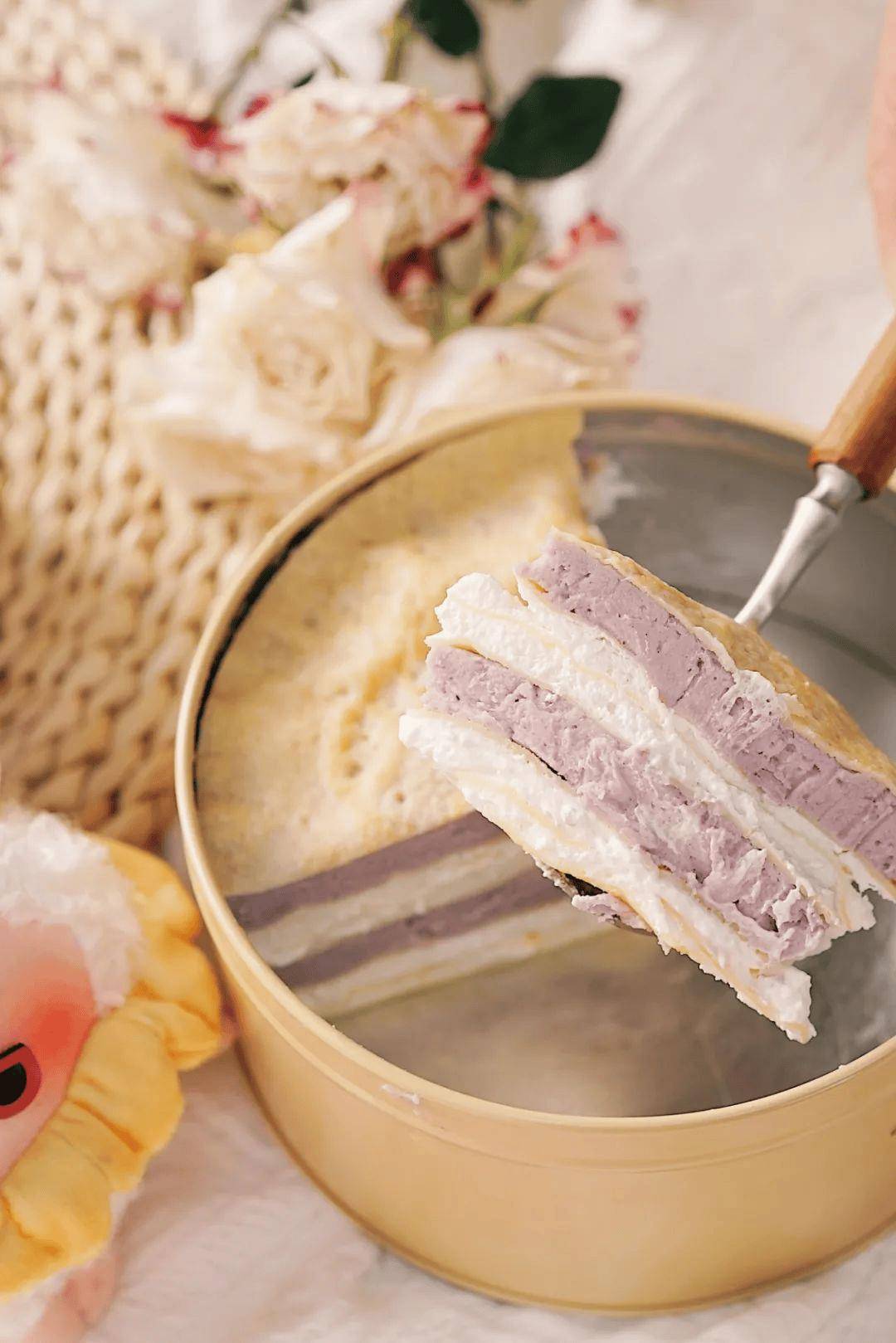 2/2 挤了两层奶油后,再挤一层厚厚的芋泥,抹平。再重复之前的操作,两层奶油,一层芋泥。最后再盖上一张千层皮,就可以放入冰箱冷藏定型了。(一个盒子差不多用7张千层皮)