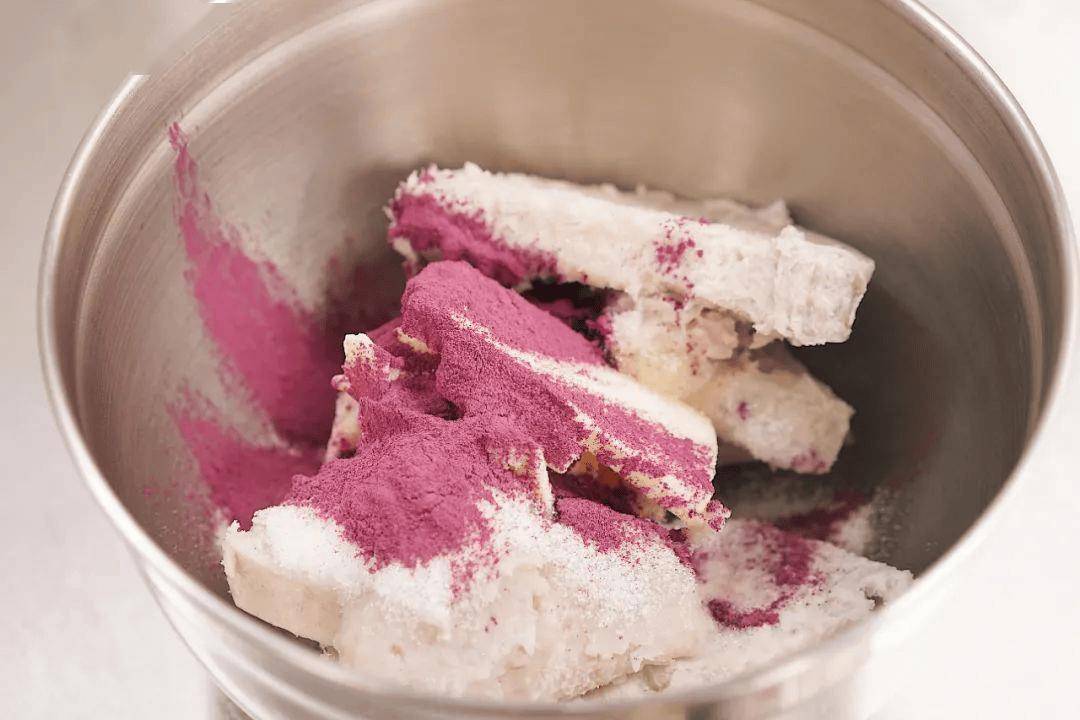 1/3 500G荔浦芋头蒸熟倒入碗中,加入50G黄油、43G白砂糖、6G紫薯粉,捣成泥状。芋头的余温会慢慢融化黄油,芋头捣碎后会更粘合。