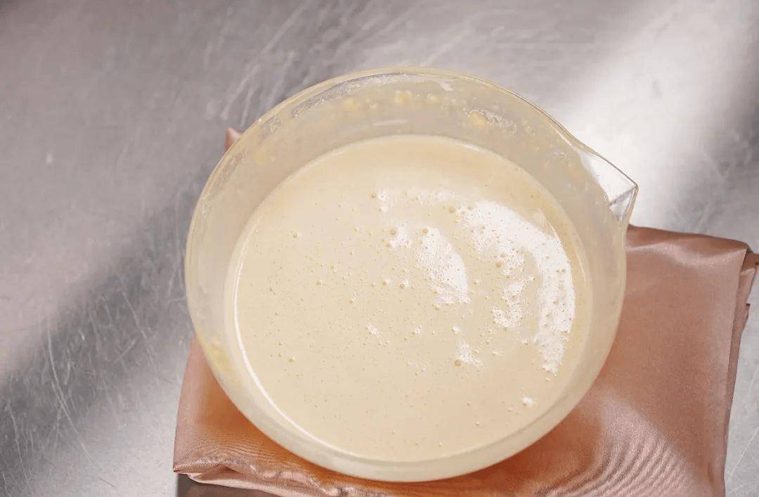 2/3 蛋黄面糊中分次加入300G牛奶,慢慢搅拌成液体状态,搅拌好的少量蛋糊倒入25G融化的黄油,搅拌黄油进行乳化,充分乳化后,将黄油缓缓倒入蛋糊中,混合均匀。做好的面糊过筛一遍,盖上保鲜膜放入冰箱冷藏1小时。