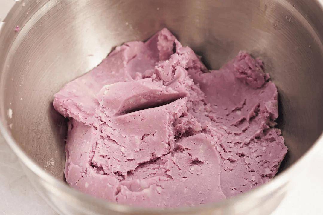 2/3 芋泥再加入100G淡奶油,100G牛奶翻拌融合,这时候的芋泥散发着奶乎乎的香气,有粘性,湿乎乎,随手挖点都超好吃!