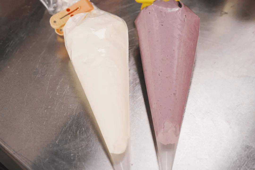3/3 350G淡奶油加入20G白砂糖,打发。把芋泥和奶油分别装入裱花袋中,备用。