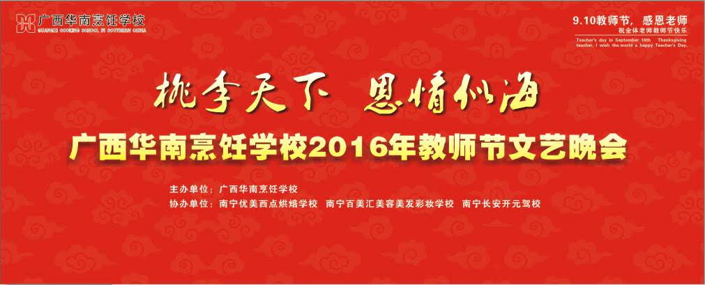 为庆祝第32个教师节到来,将于9月9日晚8:00,在中尧校区操场隆重举办广西华南烹饪学校教师节晚会,欢迎广大同学到现场观看。感恩师德,共谱华章。